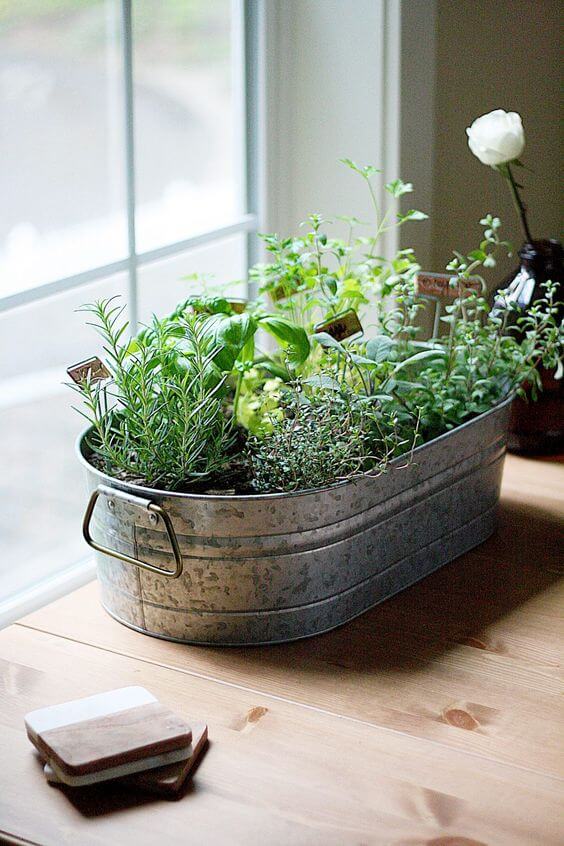 Galvanized tubs or buckets give your garden a farmhouse touch. Add drainage holes before planting your favorite herbs. The metal reflects sunlight, helping maintain warm soil.