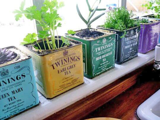 Empty tea cans bring color and nostalgia to small herb gardens. Clean them thoroughly and make small drainage holes. Add soil and tiny herbs like basil or thyme.