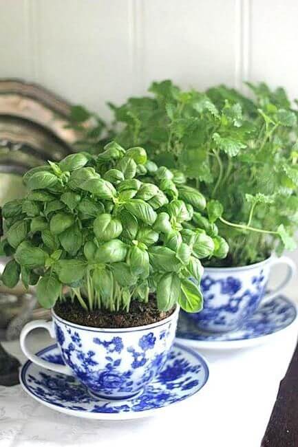 Old teacups bring elegance to small herb displays. Fill them with soil and tiny herbs like rosemary or basil. Place them near windows for sunlight and easy watering.