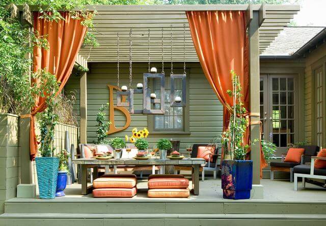 To recreate this look, install a curtain rod or wire under a pergola, then choose bright, weather-resistant fabric to keep the fun going all season.