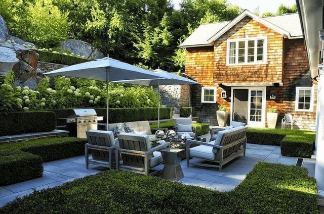 Image Credits: PngioThere s something undeniably calming about symmetry, and this patio leans into it beautifully. Neatly clipped boxwood hedges create natural partitions that feel tailored yet soft, offering just enough privacy to keep things peaceful.