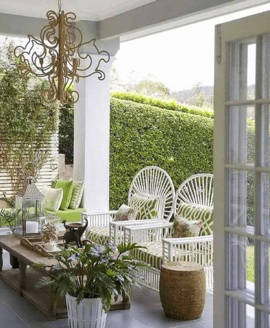 The white wicker furniture and soft green cushions keep things airy and inviting, perfect for morning coffee or a peaceful afternoon read.