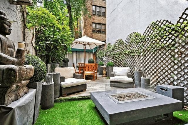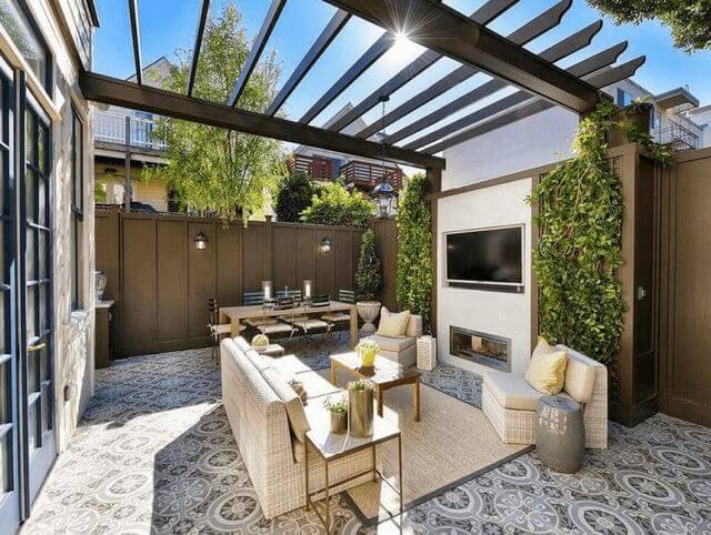 Image Credits: UnknowThis cozy patio uses tall fencing and vertical vines to carve out a peaceful nook without blocking the sunshine. A pergola adds height and filtered light, while soft furnishings and an outdoor fireplace bring the comfort of indoors outside.