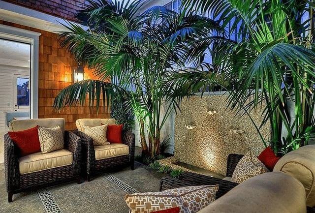 Wicker furniture with plush cushions invites you to sit back and relax, while a trickling water feature offers a calming backdrop.