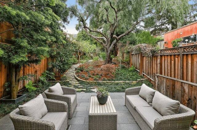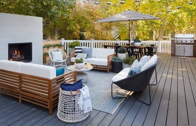 If you’re aiming for a private retreat with a polished finish, this setup is a perfect model. Just layer in lush plants, hang some overhead lights, and let your outdoor seating area shine.