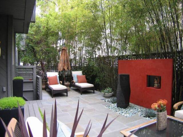 You can recreate this effect by combining a tall, painted wall with layered plantings like bamboo or grasses. Add cushioned loungers and a sculptural water feature to turn your patio into a personal spa sanctuary.