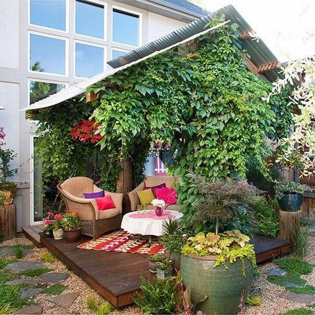 Image Credits: TheofyWith climbing vines draping over the roof like a living curtain, the space feels tucked away and wonderfully serene. Bright pillows and a patterned rug add bursts of color, inviting you to curl up with a good book or share coffee with a friend.
