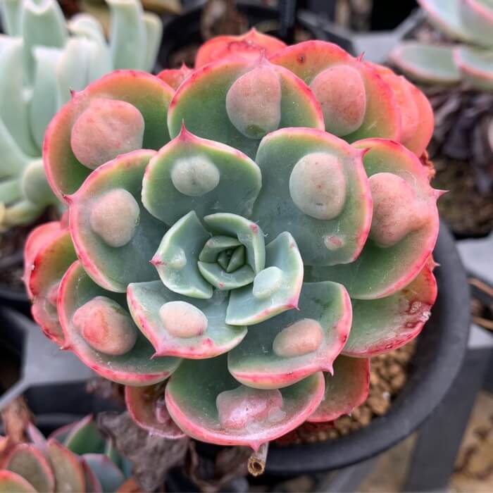 These adorable rosettes feature green leaves with plump “raindrop” bumps near the tips. When exposed to cool weather and bright light, they take on lovely red or rosy-pink hues.