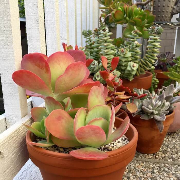Flat, paddle-like leaves start bright green but flush with red-pink edges under long sunlight exposure. This kalanchoe loves warmth and grows best in south-facing spots.