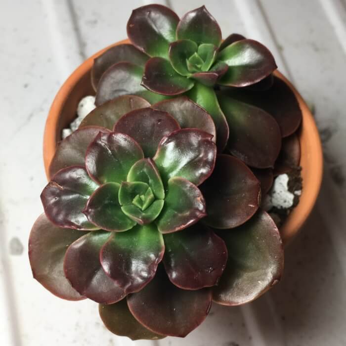 This striking Echeveria begins as vibrant green and slowly darkens into deep chocolate brown or black. It thrives in bright but indirect sunlight.