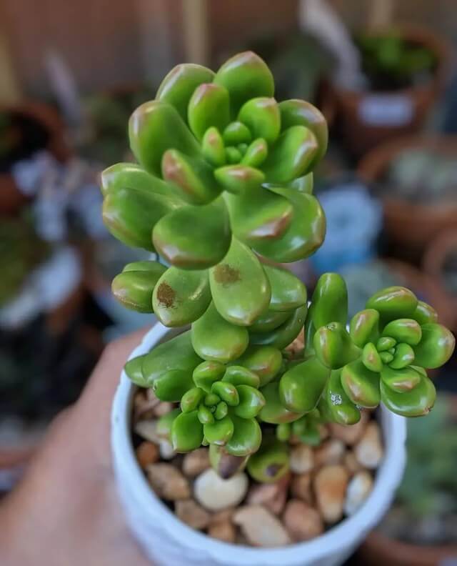 The contrast of new green growth against older bronze leaves creates year-round interest. Use it as a bold accent in mixed succulent planters.