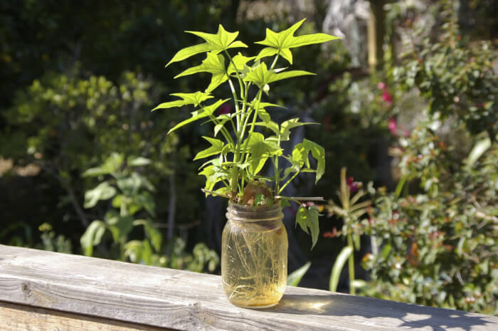 The heart-shaped leaves of ornamental sweet potato vines add a lush, tropical feeling when grown in a glass container. Just a cutting placed in water will start to sprout roots and climb.