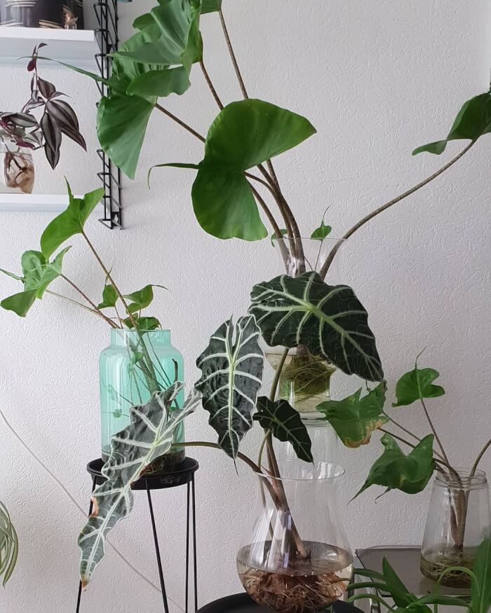 Alocasia s bold leaves and sculptural shape are eye-catching, even without soil. You can root a cutting or bulb in a tall glass and enjoy its elegant lines as the roots grow below.