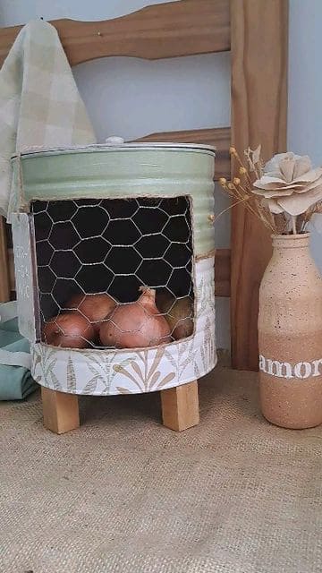 Who would ve guessed an old paint can could become this charming little onion keeper? I put this together to solve my onions rolling everywhere problem.