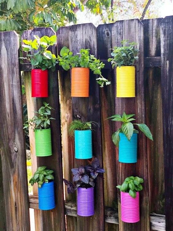 Hanging tin cans on wooden backyard fences can help you save floor space. After hanging, plant your favorite flowers, herbs, or succulents in the cans.