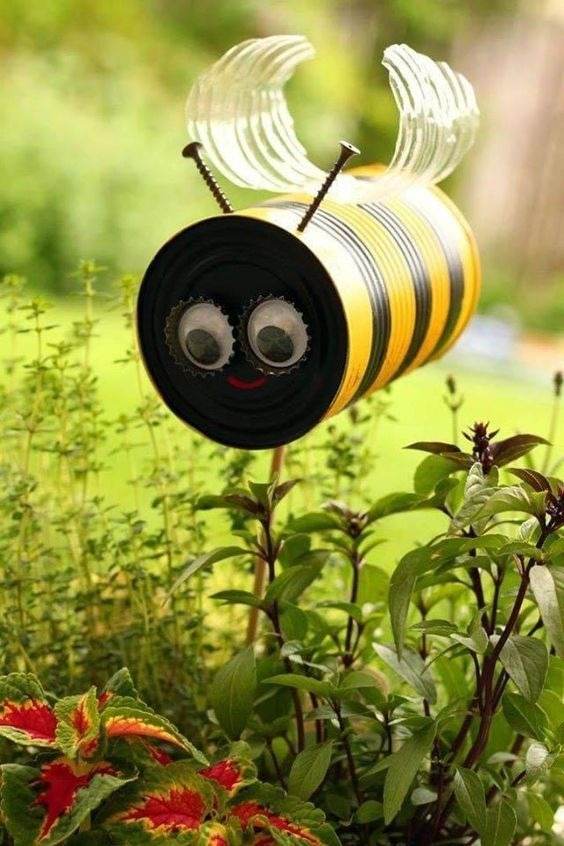 Step 4: Screw in as antennae on top of the bee s head. Lastly, attach the can to a garden stake and plant it in a flower bed or herb patch.