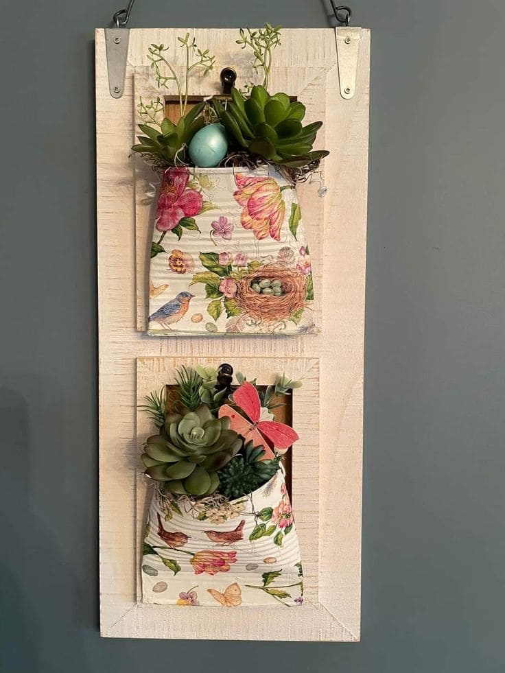 Step 3: Use hot glue to secure the cans onto the board. Fill with faux greenery, tiny eggs, or seasonal decorations.