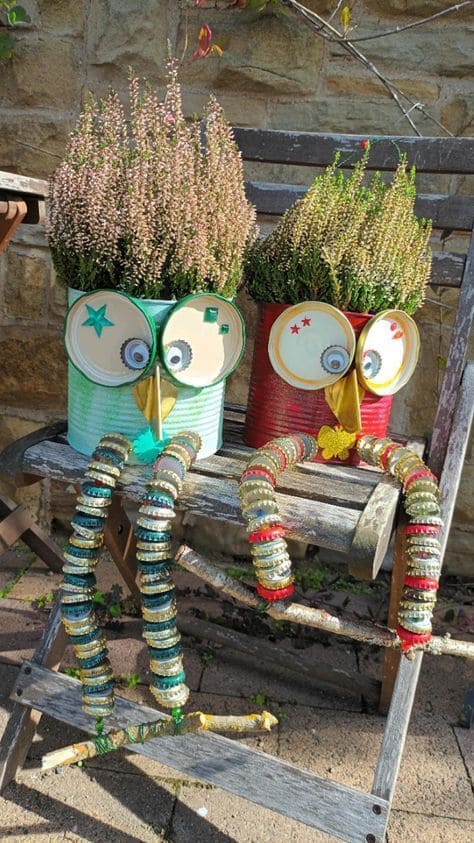 You can make some funny tin can birdfeeders and fill the cans with birdseed, nuts, dried fruits, or any other bird-friendly food. Then, enjoy watching the birds visiting your garden.