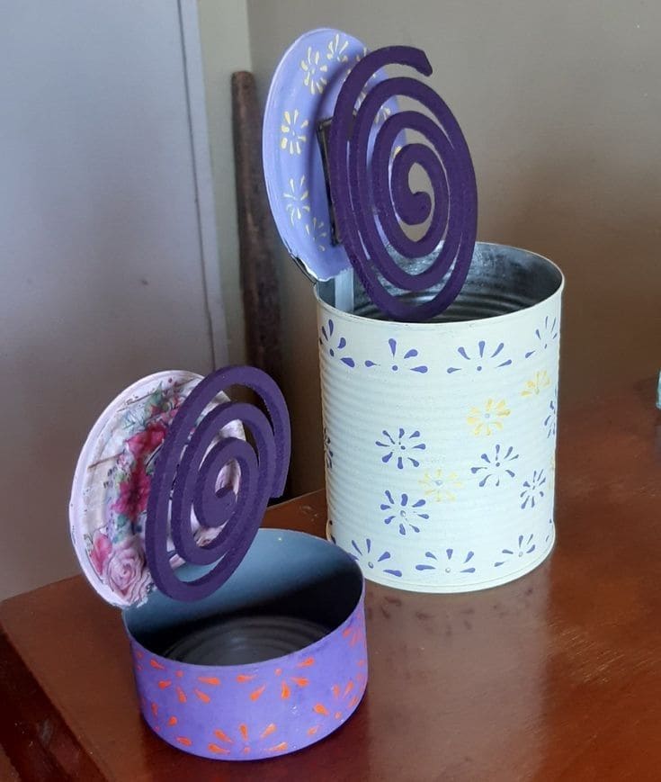 This creative and artistic upcycled tin can project uses painted cans to display spiral coils, like mosquito repellent coils or decorative swirls.