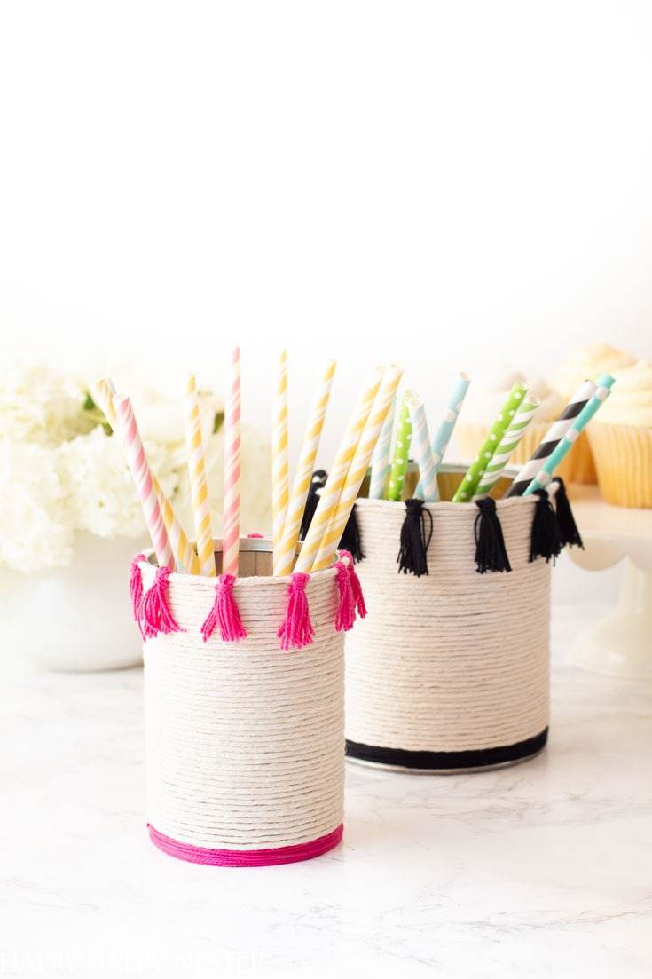 These twine-wrapped tin cans with playful tassels add a chic, rustic vibe to any party table or workspace. Stylish enough for straws and utensils, and simple enough to create in under 30 minutes.