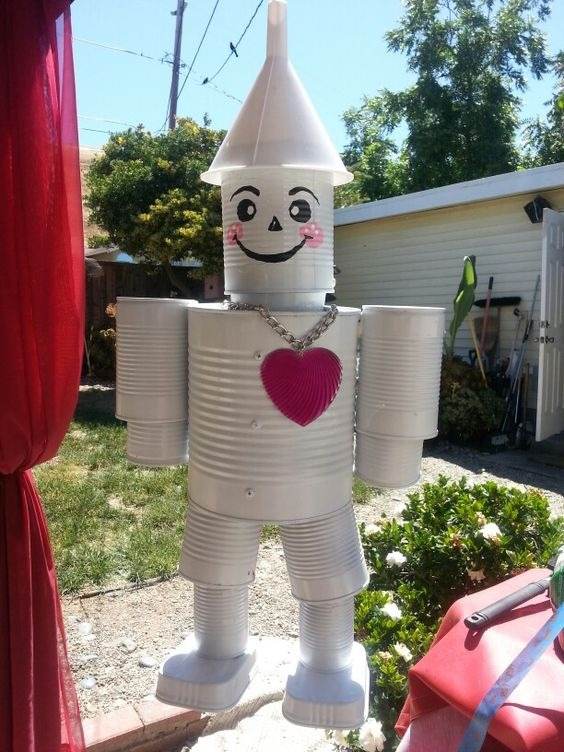 This charming tin man, inspired by The Wizard of Oz, is built entirely from recycled tin cans and a plastic funnel. It s not just a craft, it s a statement piece.