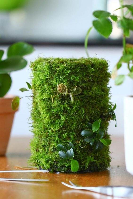A moss tin can is a lovely vase and planter. To keep your moss alive and green, you need to mist it with water regularly and avoid direct sunlight.