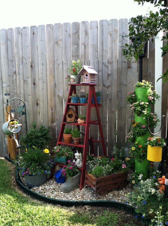 This corner setup shows how everyday items can be turned into delightful garden treasures. An old red ladder is repurposed as shelving for birdhouses, pots, and flowers, while a wooden crate becomes a rustic planter full of greenery.