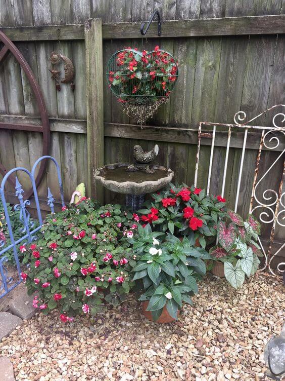 You can recreate this by grouping colorful flowers like impatiens, begonias, or caladiums around an old birdbath. Hang a basket or planter above to draw the eye upward and make the corner feel more complete.