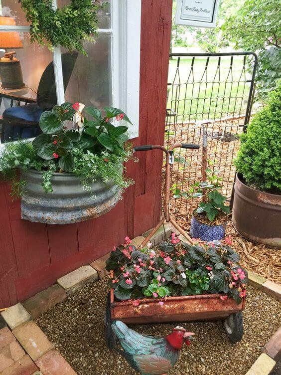Old, rusty containers can become some of the most charming planters in your garden. This little corner shows how vintage pieces like a metal wagon or a weathered tub can be filled with colorful flowers to create a rustic look.