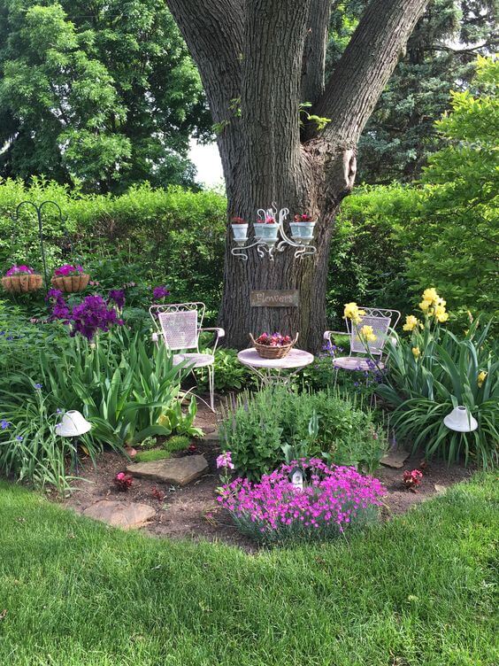 Here s a corner that feels like a secret retreat tucked under the shade of a large tree. Two vintage-style chairs and a small table create the perfect spot to sip tea or enjoy a quiet afternoon surrounded by blooms.