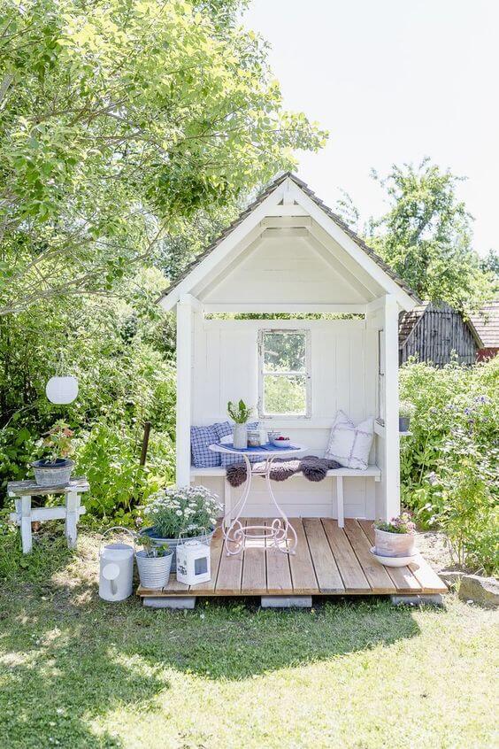 This little garden house creates the dreamiest spot to relax with a book or enjoy a quiet cup of tea. Its crisp white walls and cozy cushions make it feel like a peaceful escape right in the middle of the greenery.