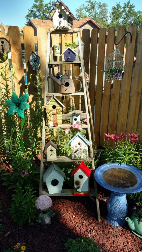 An old wooden ladder becomes a tiered display for colorful birdhouses, a watering can, and tiny plants. Beside it, a blue birdbath invites feathered friends, making the whole spot feel like a natural sanctuary.
