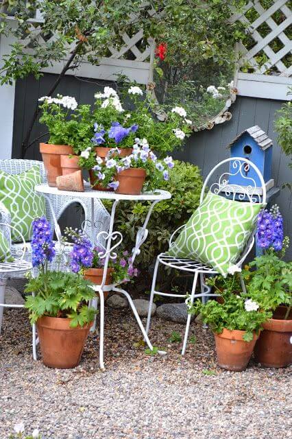 To recreate this look, arrange your pots around seating and mix tall flowers with low ones for depth. A small birdhouse or mirror accent can finish the setup and make it feel extra cozy.