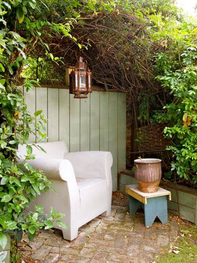 You can recreate this by placing a comfortable seat under your climbing plants or pergola and adding a light fixture for evening charm. Keep the space uncluttered so it feels calm and private, just like a little outdoor hideaway.