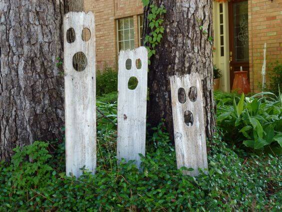 Your old fence boards can become the stars of Halloween night with this easy ghost craft. By painting them white and carving or cutting simple oval âfaces,â you instantly get a set of spooky spirits that look like they just floated out of the garden.