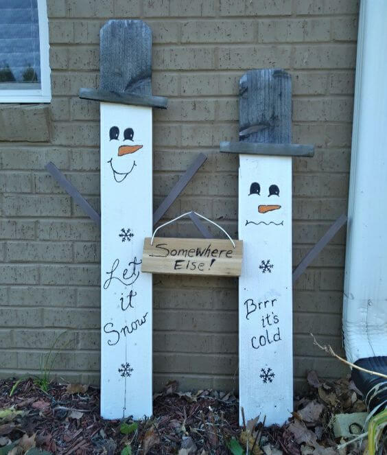 A touch of humor on the signs, like âLet it Snowâ or âBrrr, it s cold,â makes them even more charming. To make them, cut your boards to different heights for variety, paint, and attach wooden scraps for hats and arms.