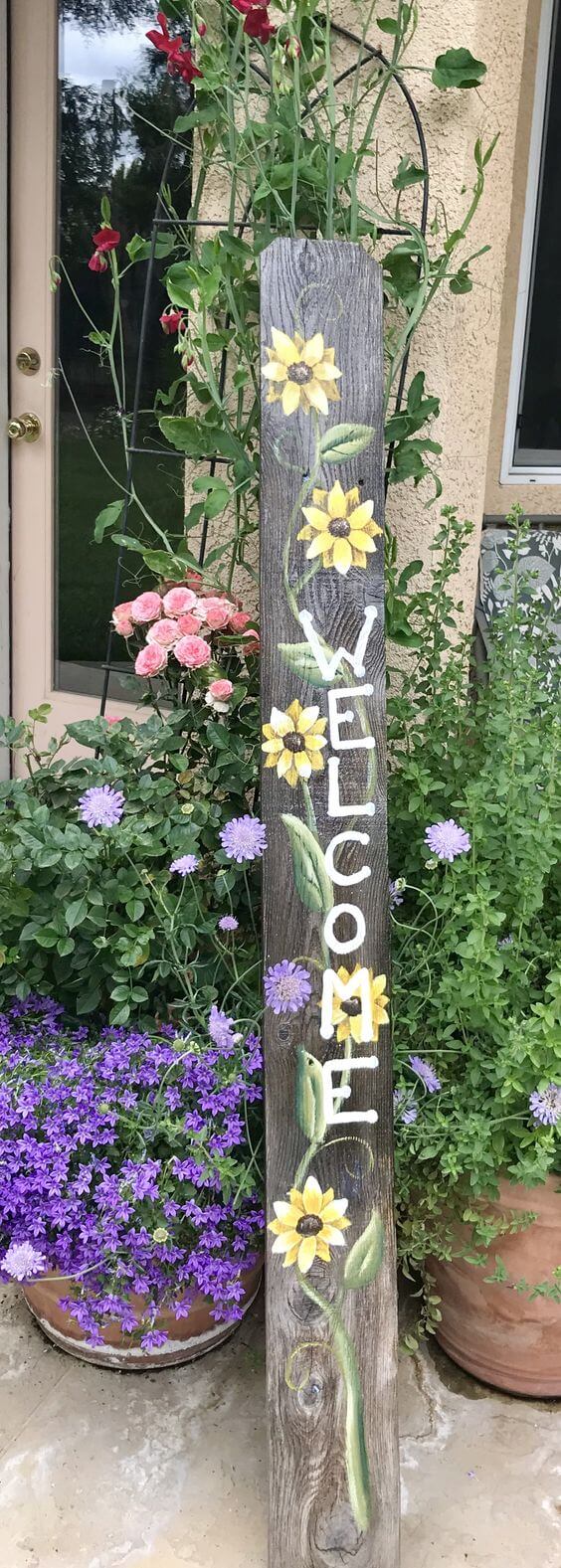 This cheerful welcome sign brings life to the garden with hand-painted sunflowers climbing up the board. The weathered wood gives it a rustic background that makes the bright yellows and greens pop beautifully.