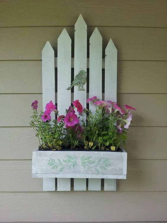 Simply attach a rectangular planter box to a few vertical boards, giving it the look of a miniature fence. A quick coat of paint in white or pastel shades makes it look fresh, and you can stencil a floral design or a phrase for added personality.