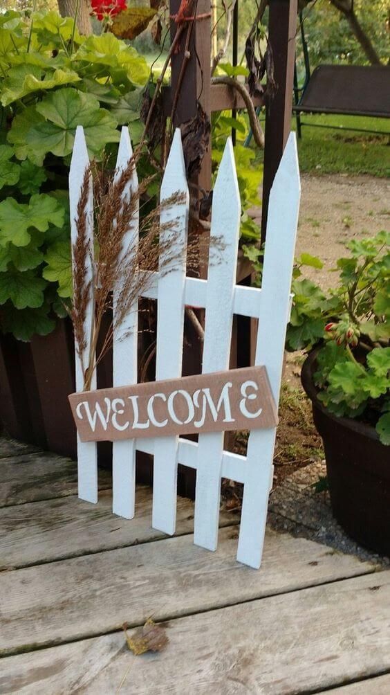 Old fence posts make perfect bases for a charming welcome sign to greet your guests. By cutting and painting a few boards white, you can create a rustic mini-picket fence backdrop.