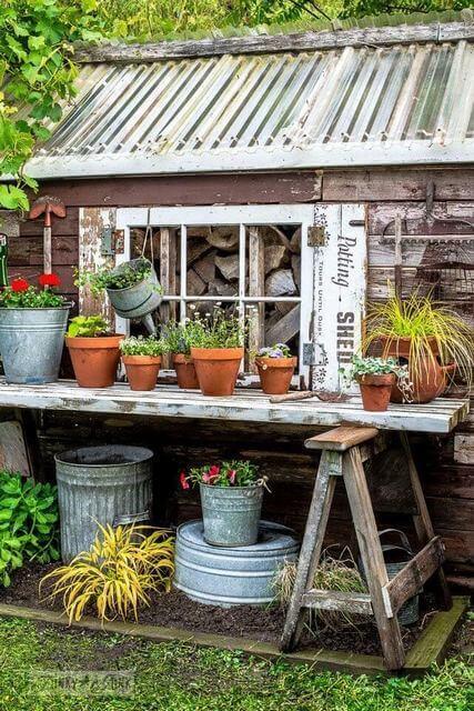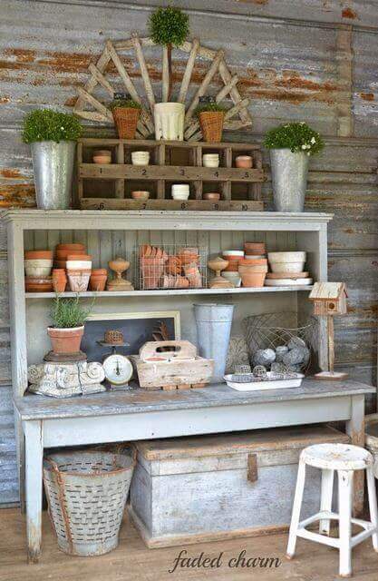 This potting bench feels like a little farmhouse tucked into your garden. With shelves stacked high and lined with clay pots, vintage scales, and wire baskets, it gives both storage and style.