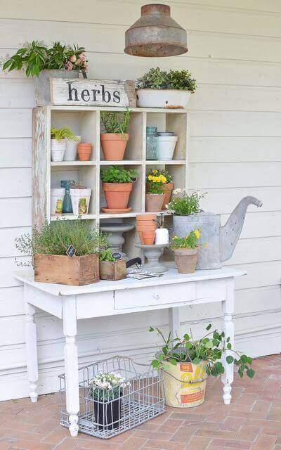 This sweet cubby-style potting bench doubles as a mini herb station and display piece. Small terracotta pots, watering cans, and garden tools tuck neatly into each compartment, making the setup feel both tidy and charming.
