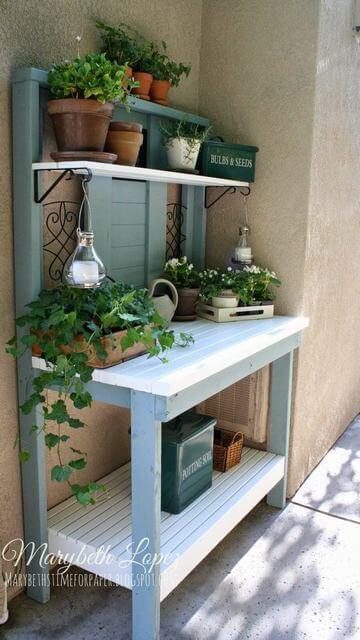 A soft blue frame paired with crisp white surfaces makes this potting bench stand out with charm. It s both refreshing and functional, offering a clean space for potting and planting.