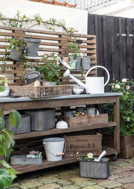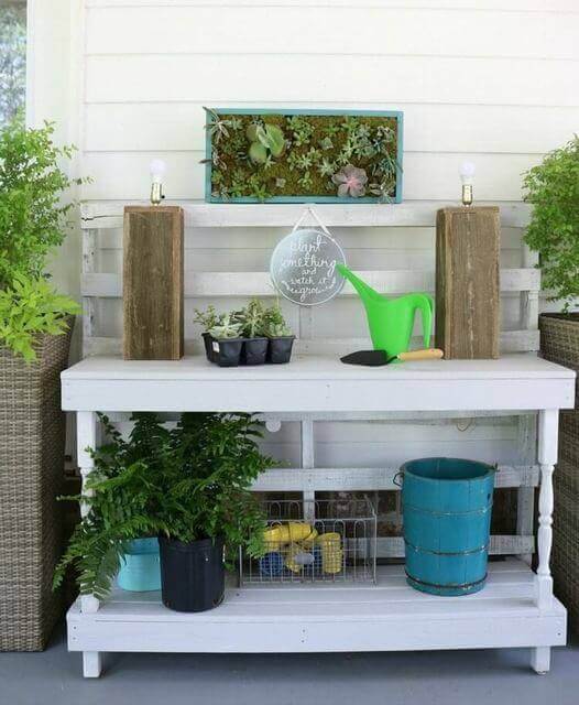 Here s a potting bench that strikes a balance between rustic charm and clean design. The white spindle legs give it a classic touch, while the pallet backing adds texture and warmth.