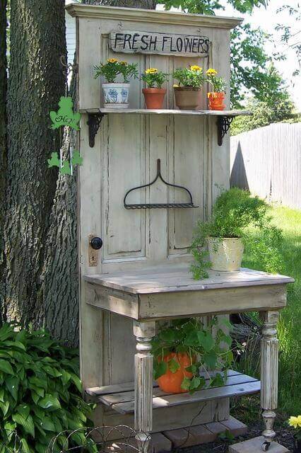 #1 Repurposed Old Door Potting Bench Idea