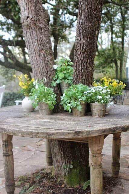 This potting idea turns nature itself into the centerpiece. Instead of cutting down a tree, the table is built around it, creating a rustic bench with a unique, organic charm.