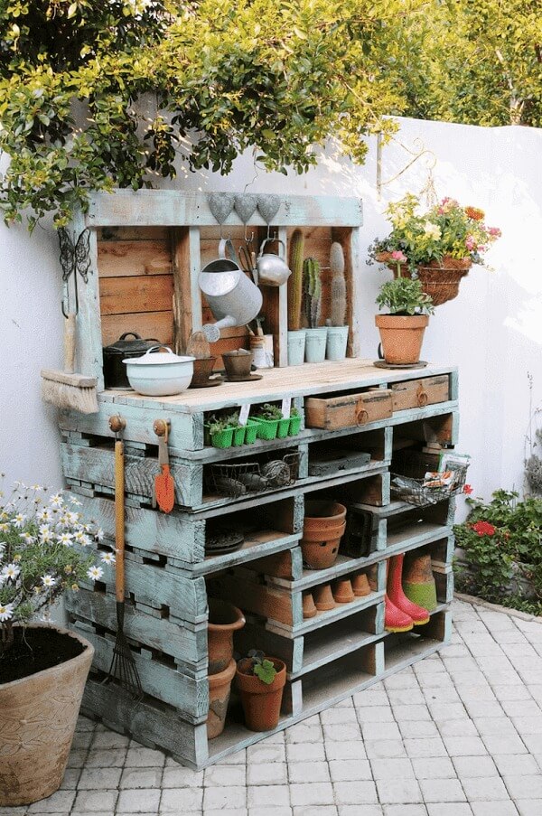 This pallet potting bench is a smart and eco-friendly way to set up a gardening workspace. Its layered shelves provide ample storage for pots, boots, and garden tools while keeping everything within easy reach.