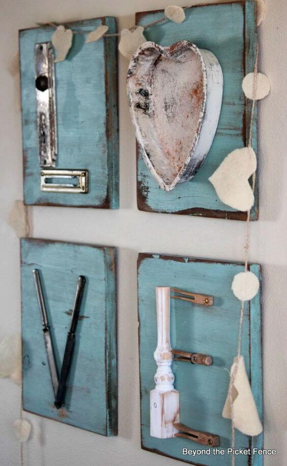 To start, pick a sturdy wood board as your base and give it a distressed paint finish for that weathered look. Then play around with your collected junk pieces until they resemble the letter you want.