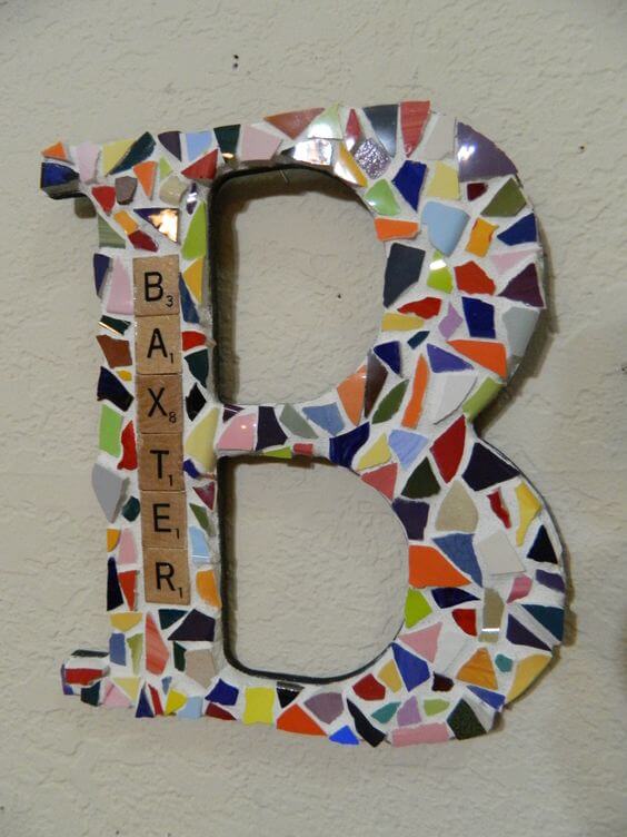 You can start with a wooden or cardboard letter base, then spread a thin layer of tile adhesive across the surface. Arrange your colorful pieces however you like, leaving small gaps in between.