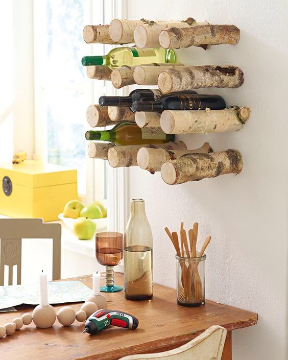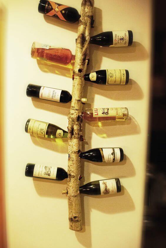 Bring the outdoors into your home with this clever branch wine rack that doubles as wall décor. Thick, sturdy branches are mounted horizontally to the wall, creating natural cradles where bottles can rest securely.