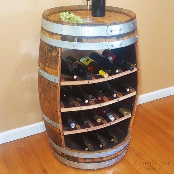 This rustic wine barrel bottle holder is a showstopper that instantly adds charm to your home. By cutting open part of an old wine barrel and fitting it with shelves, you create a storage piece that s both functional and full of character.